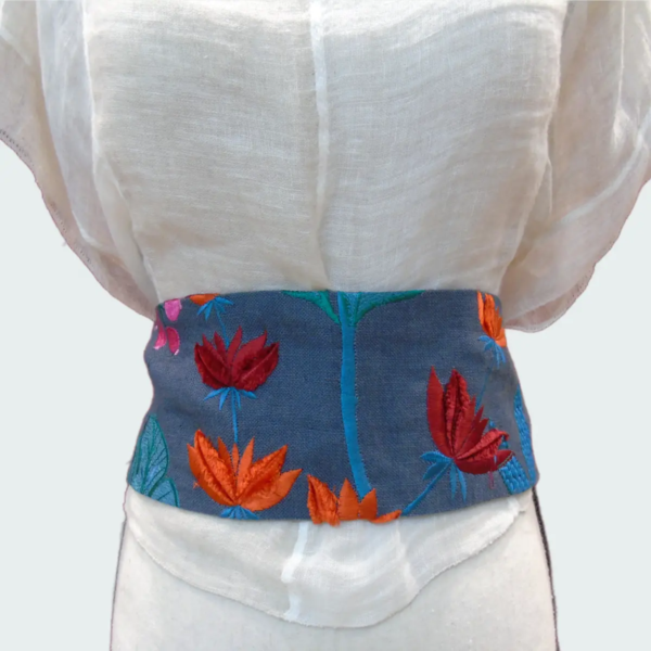 Aggiungi un tocco di eleganza e stile al tuo guardaroba con questa cintura in lino di ispirazione giapponese. Realizzata con una base in lino di colore blu intenso, questa cintura si distingue per i suoi splendidi ricami floreali a rilievo che conferiscono un aspetto raffinato e unico.