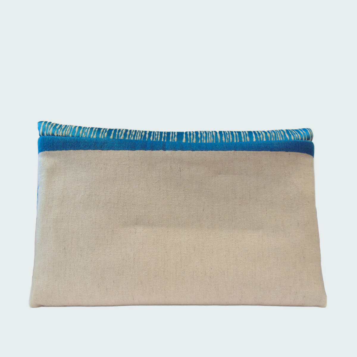 Lavorazione Artigianale in Tweed di Lino, caratterizzata da un vibrante colore naturale che si fonde armoniosamente con una patta in raso turchese. I ricami lineari verticali aggiungono un tocco di raffinatezza e originalitร a questo accessorio unico